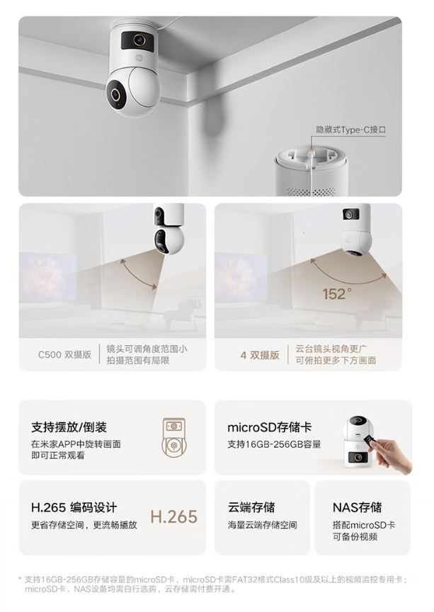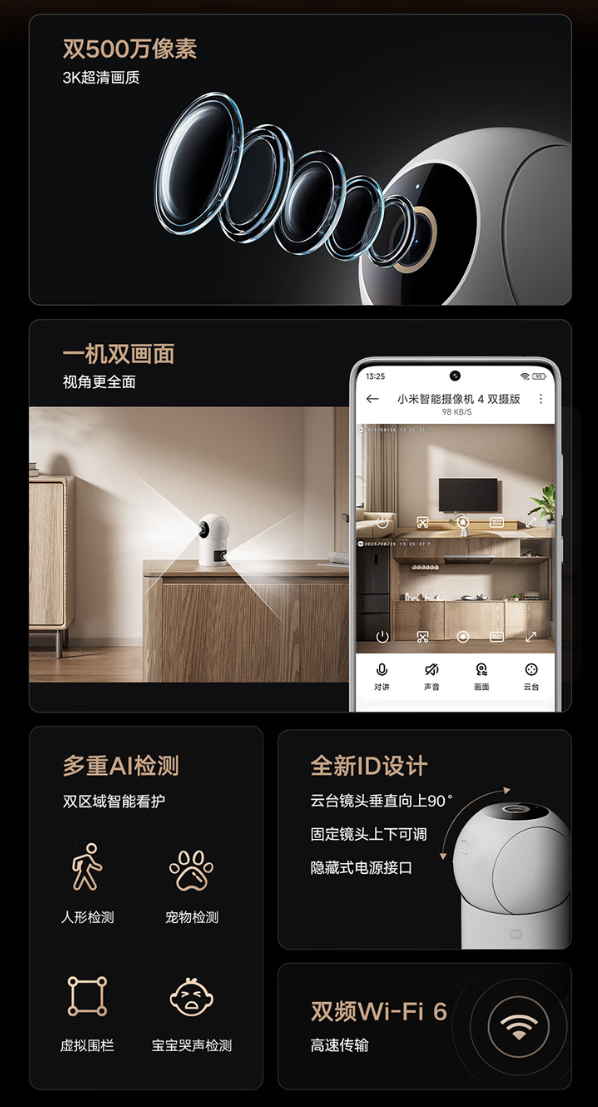 该产品支持小米澎湃智联,双镜头皆能触发设备联动;还可根据家人使用习惯,定制更多个性化联动场景。此外,新品还内置双频 Wi-Fi6 智能芯片、米家安全芯片,支持双向语音实时通话。