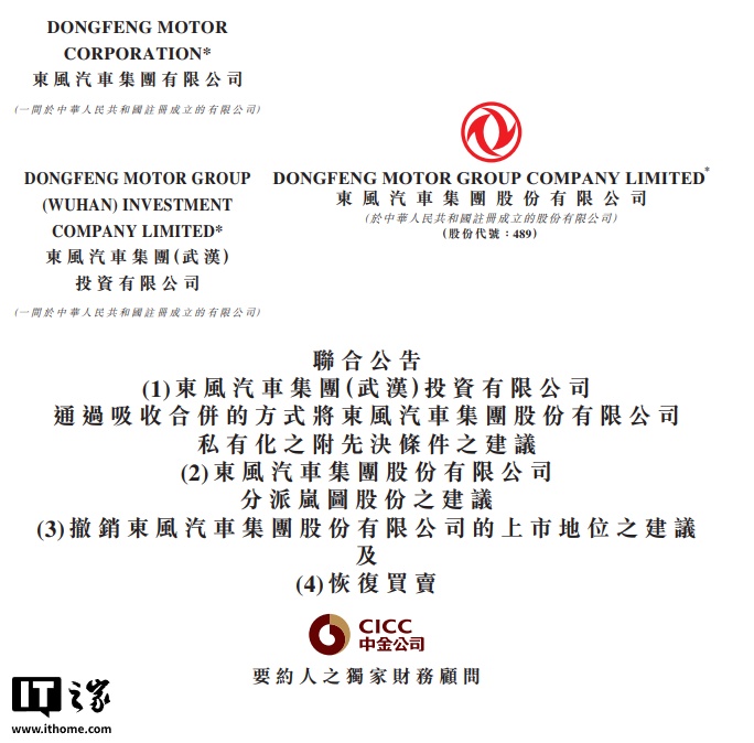 IT之家 8 月 23 日消息,东风集团股份 8 月 22 日晚发布公告,宣布将通过其子公司东风汽车集团(武汉)投资有限公司进行「吸收合并」实现私有化退市。