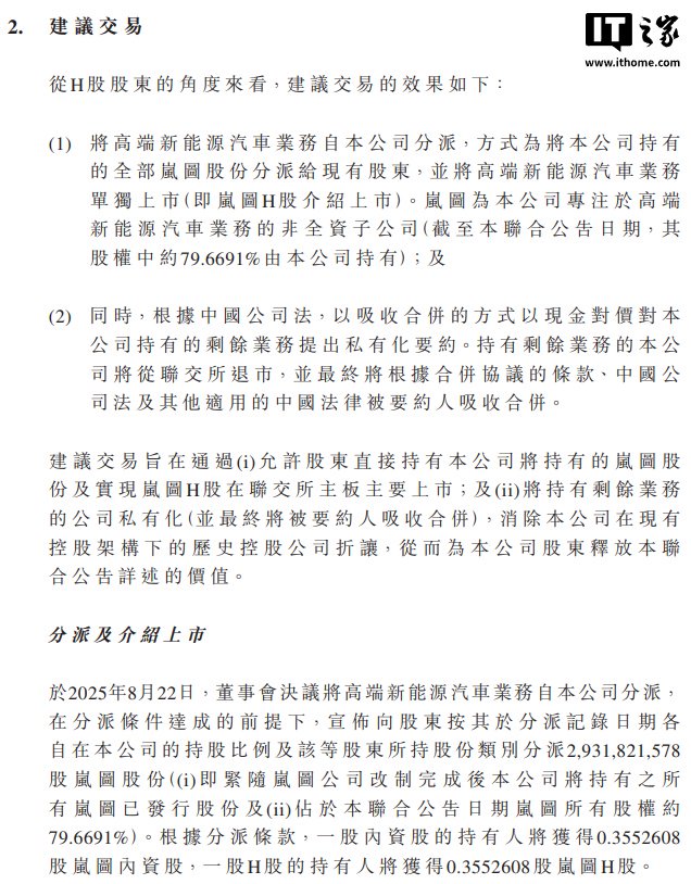 IT之家从官方获悉,本次交易采用岚图汽车股权 + 现金对价支付,总体收购价格为 10.85 港元 / 股,其中现金对价 6.68 港元 / 股,岚图股权对价 4.17 港元 / 股。