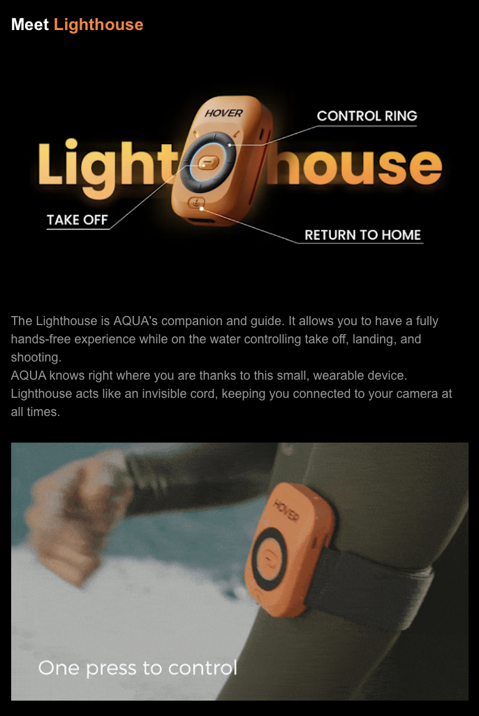 官方重点介绍了这款无人机随附的 LightHouse 腕带外设,用户在佩戴腕带后,即可按下腕带的按钮让无人机对自己进行跟拍、同时可一键召唤无人机 / 一键令无人机降落。