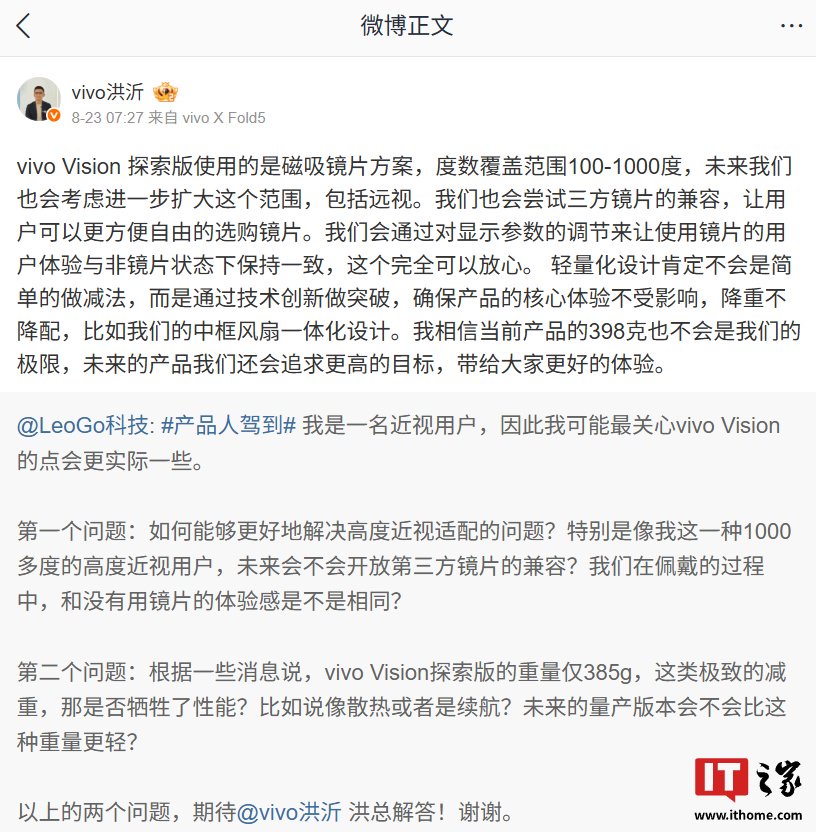 vivo 智慧终端产品总经理洪沂昨日在微博解答了关于这款头显的近视适配和减重是否减配相关问题,其中提到:vivo Vision 探索版使用磁吸镜片方案,度数覆盖范围 100-1000 度,会尝试三方镜片的兼容。另外他表示,轻量化设计不会是简单的做减法,而是通过技术创新做突破,确保产品的核心体验不受影响。