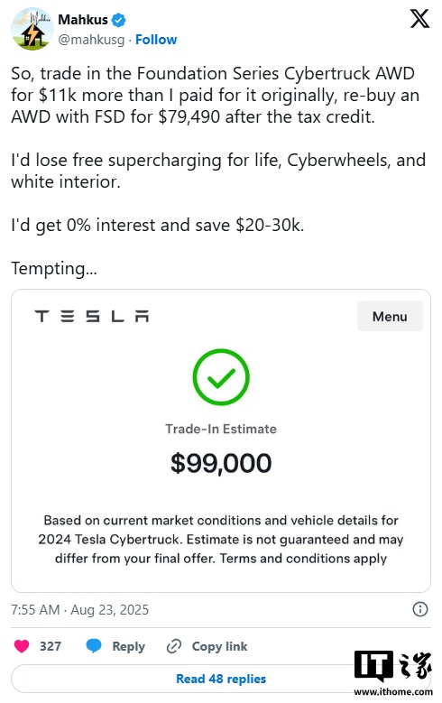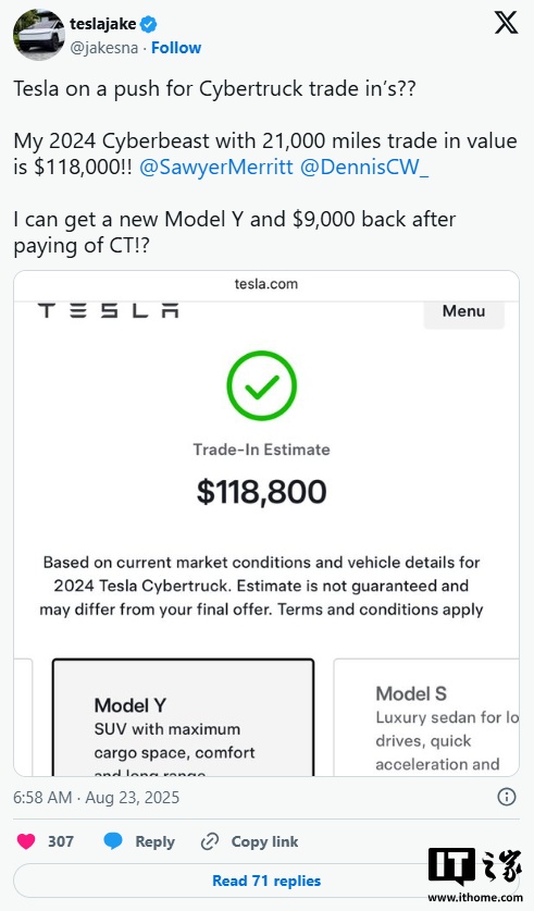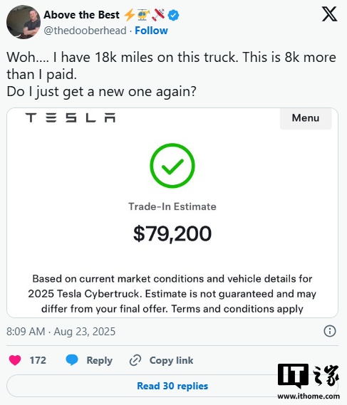 IT之家 8 月 24 日消息,本周末,特斯拉的二手车置换估值系统出现了故障,导致许多 Cybertruck 以旧换新的估值高于其原始购买价格。