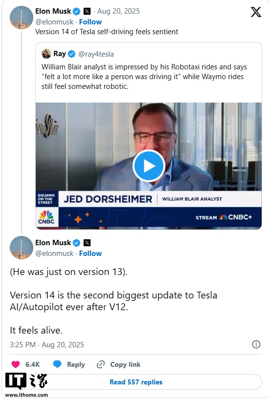 IT之家注意到,马斯克在 X 社交平台上进一步分享了 FSD V14 的细节。在回应一位威廉・布莱尔分析师发布的视频时,该分析师提到特斯拉的 Robotaxi 服务相比 Waymo 的机器人操作,更像有人在驾驶。对此,马斯克表示:“特斯拉自动驾驶的第 14 版感觉像是有感知能力的。”