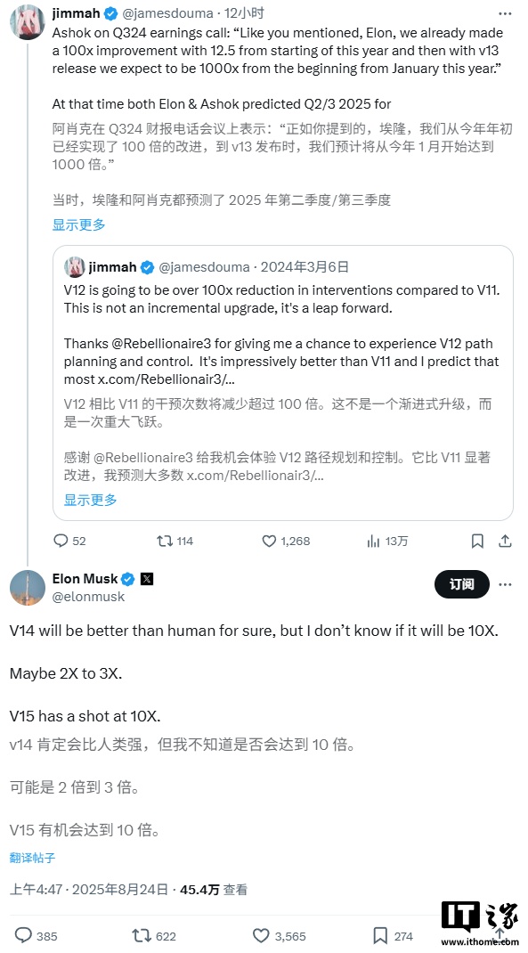根据 X 用户 @jamesdouma 的推测,如果 V14 在初期测试阶段的表现如马斯克所言,相比现有的 V13 有明显提升,那么成熟后的 V14 可能会使 FSD 进入“比人类驾驶好 10 倍”的水平。