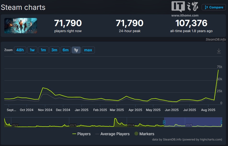 受此影响,《战地 2042》Steam 24 小时同时在线峰值重回 7 万上方,截至IT之家发稿当前在线人数达 71,790 人。