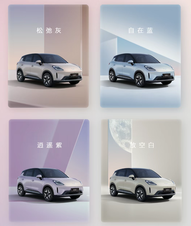 该车提供松弛灰、自在蓝、逍遥紫、放空白四款外观配色,前脸采用封闭式造型,搭配梯形散热开口和纵向通风口。大灯组采用四边形圆角设计,车身侧面采用双拼色设计,搭配宽厚的黑色轮眉和低风阻 16 英寸轮圈。车身尺寸方面,缤果 S 的长宽高分别为 4265/1785/1600 毫米,轴距为 2610 毫米。