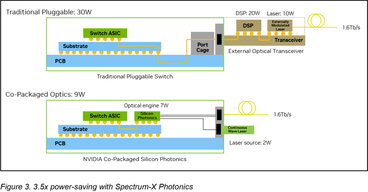 相比传统可插拔光模块,CPO 减少组件数量并提升系统可靠性外,还可以将信号损耗从 22 分贝降至 4 分贝,单端口功耗从 30 瓦降至 9 瓦。
