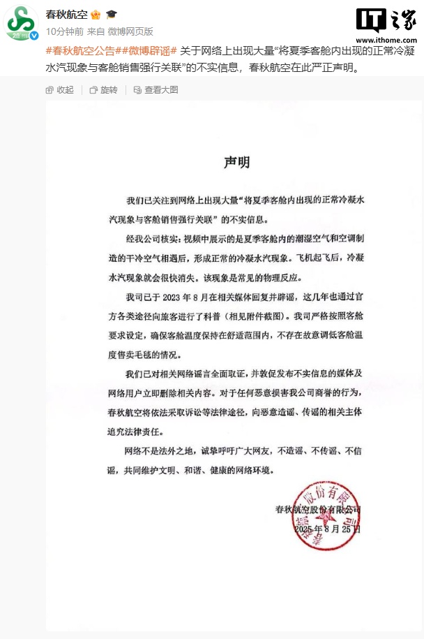 IT之家 8 月 25 日消息,春秋航空今日发布声明:公司关注到网络上出现大量“将夏季客舱内出现的正常冷凝水汽现象与客舱销售强行关联”的不实信息。