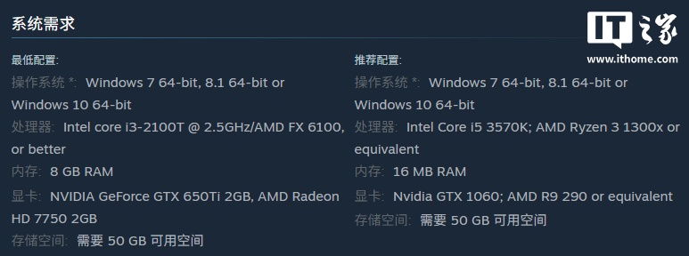 Steam 页面配置要求显示,《港警成双:来自城寨》推荐 GTX 1060 及以上显卡,需要 50GB 存储空间。