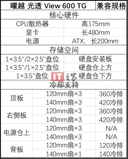 View 600 TG 宽深高三维 249×584×560 (mm),拥有 8 条扩展槽。其兼容背插主板,PCIe 插槽支持翻转以实现显卡垂直安装,配有显卡支架。