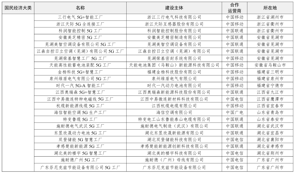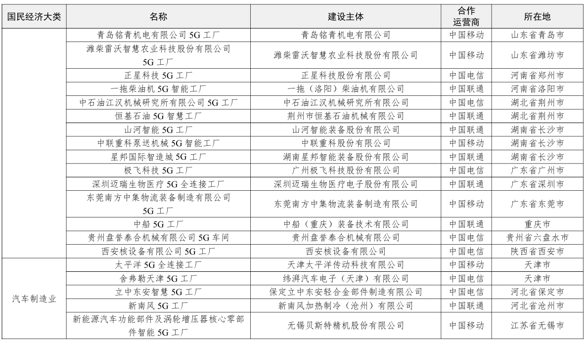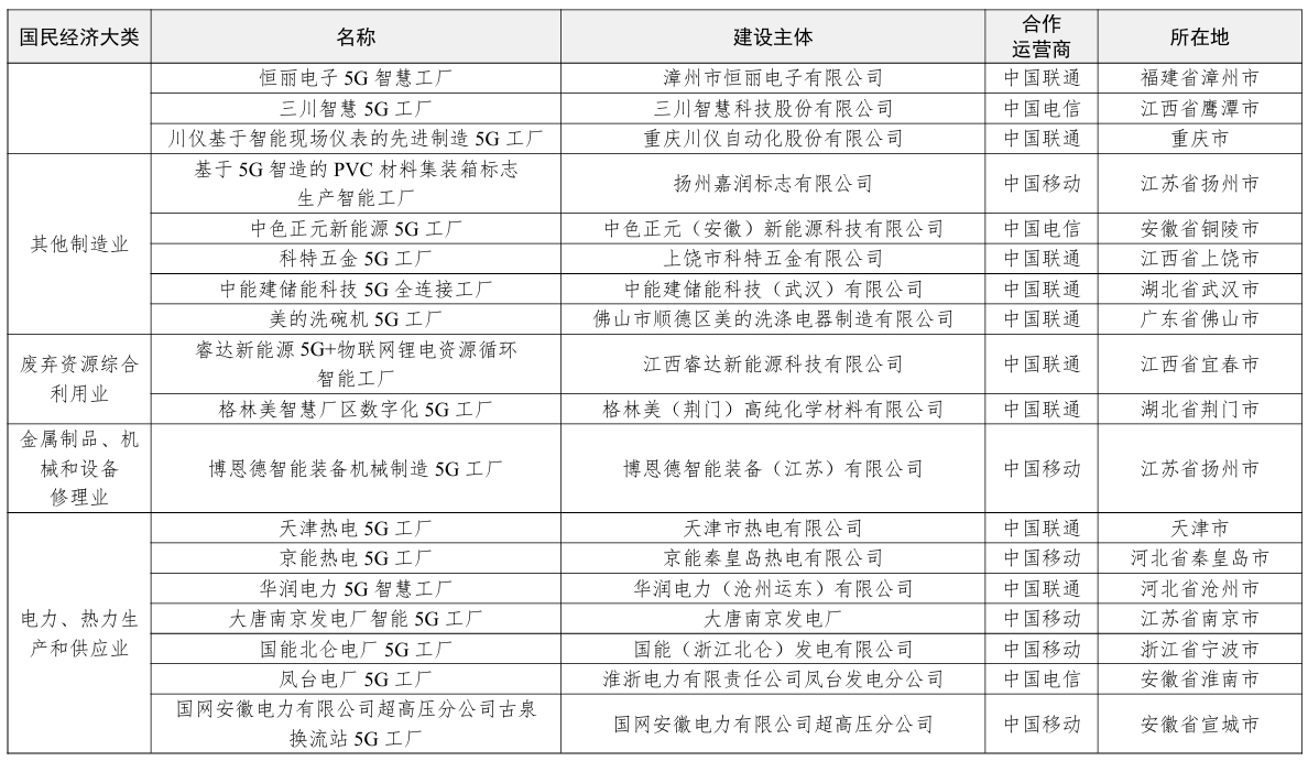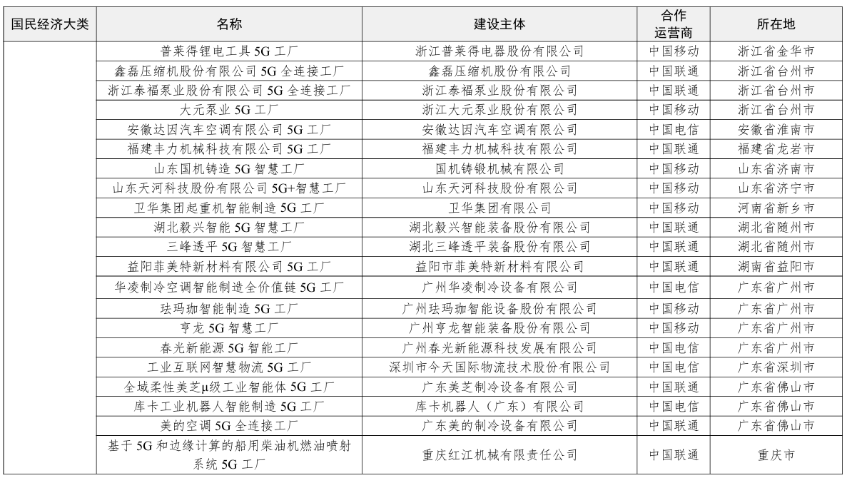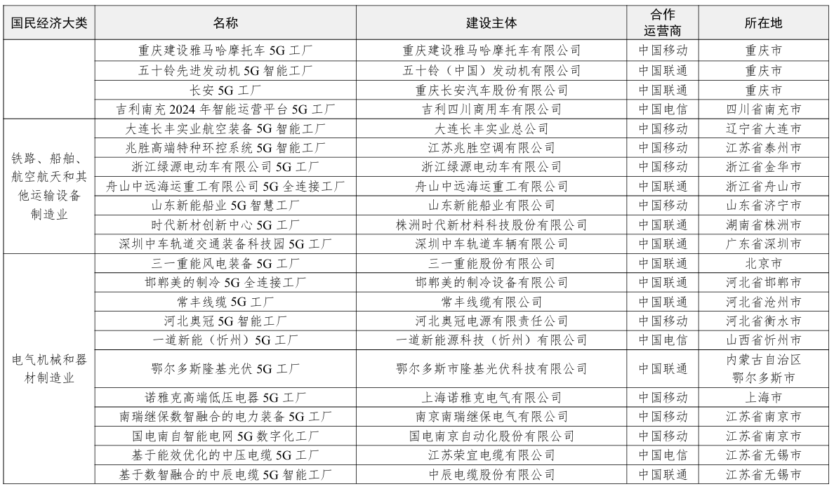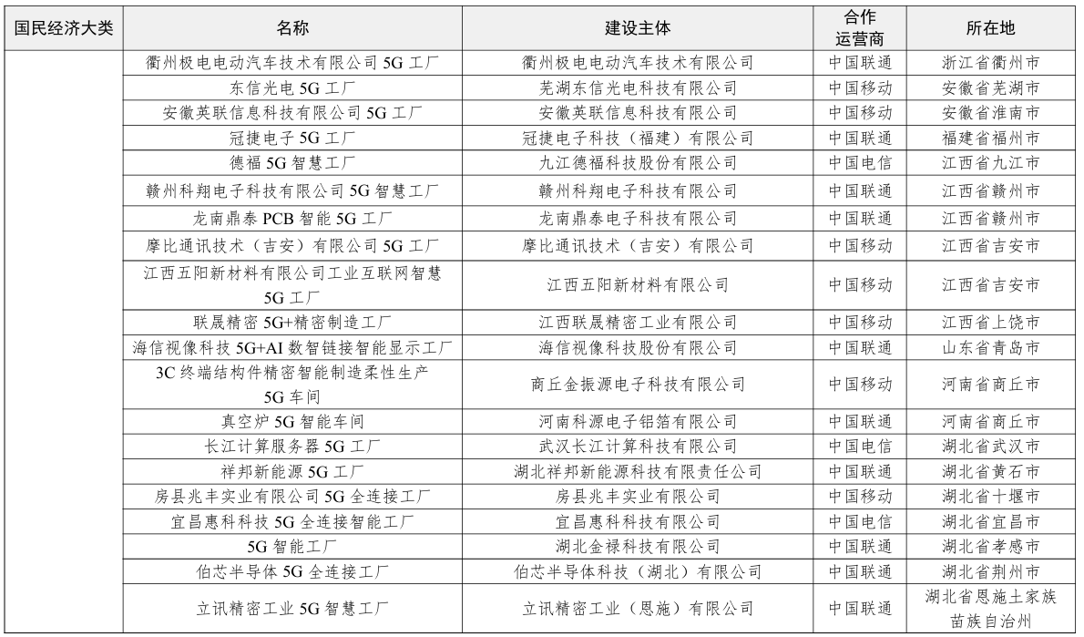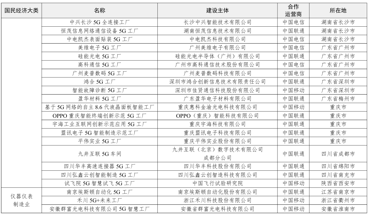 计算机、通信和其他电子设备制造业大类中,中兴长沙 5G 全连接工厂、OPPO 重庆智能终端创新示范 5G 工厂等入选。