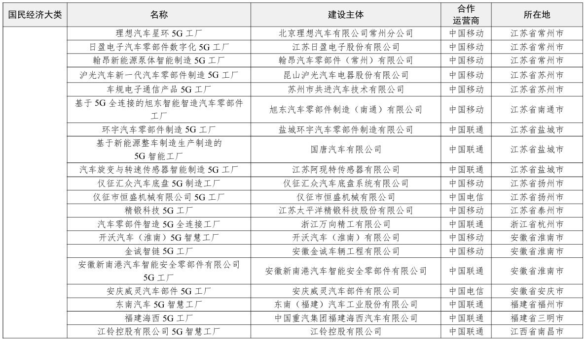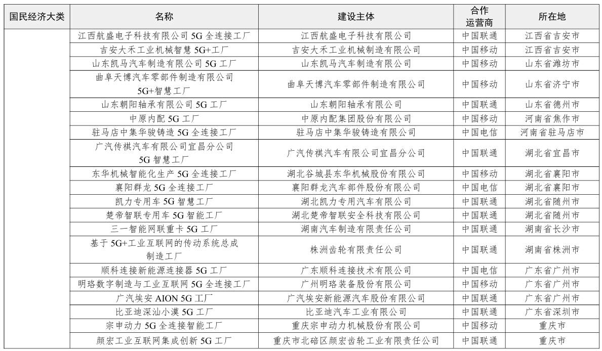 汽车制造业大类中,理想汽车星环 5G 工厂、江铃控股有限公司 5G 智慧工厂、广汽传祺汽车有限公司宜昌分公司 5G 智慧工厂、比亚迪深汕小漠 5G 工厂、宗申动力 5G 全连接智能工厂、重庆建设雅马哈摩托车 5G 工厂、长安 5G 工厂等入选。