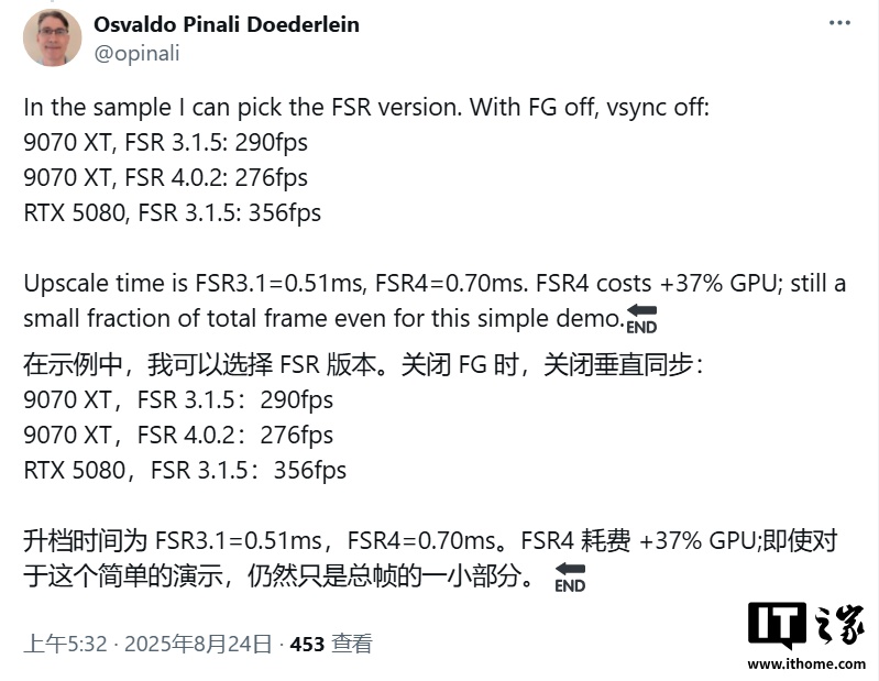 IT之家 8 月 26 日消息,科技媒体 WccfTech 昨日(8 月 25 日)发布博文,报道称在 Radeon RX 9070 XT 显卡上,AMD 最新 FSR 4 超分技术显著提升画质,但会增加 GPU 负载,导致帧率略降。