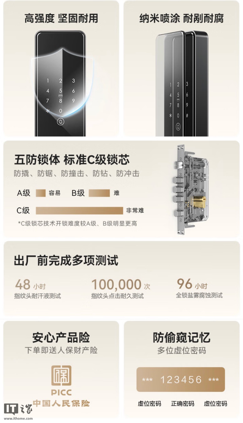 该机采用 8 节干电池供电,支持 USB-C 应急外接移动电源充电,使用直插式 C 级防盗锁芯,IT之家附产品参数如下: