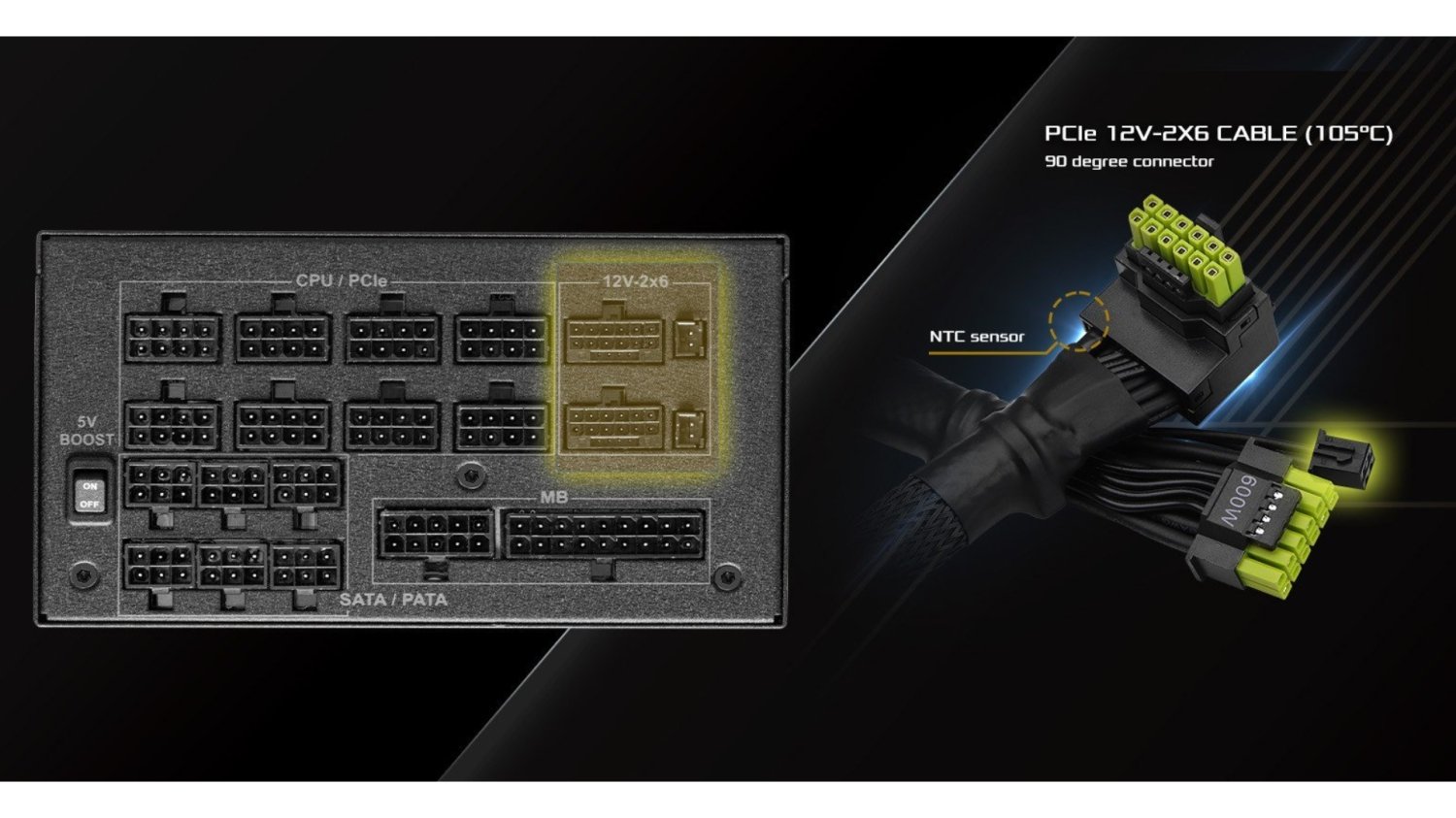 这款供电线最大亮点是内置“线缆过温保护”功能,通过安装在连接器处的 NTC 温度传感器,实时检测线缆温度,并在过热时向兼容的华擎 Taichi 或 Phantom Gaming 电源发送信号,从而降低因发热导致熔化的风险。