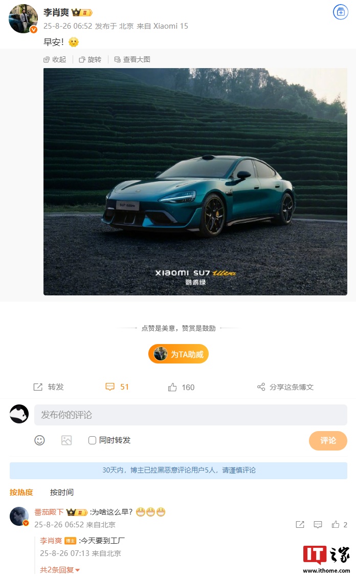IT之家 8 月 26 日消息,小米汽车副总裁李肖爽今日在微博与网友 / 车主进行了互动,并透露今日将前往工厂。