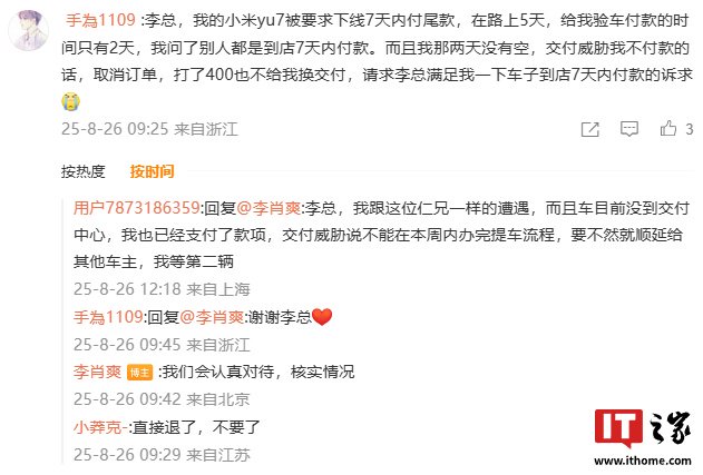IT之家注意到,有用户称自己的小米 YU7 被要求下线 7 天内付尾款,而在路上 5 天,给自己验车付款的时间只有 2 天,且问了别人都是到店 7 天内付款。用户表示自己那两天没有空,而交付威胁不付款的话将取消订单,而自己打了 400 也不给换交付。该名用户最后请求李肖爽满足自己车子到店 7 天内付款的诉求。