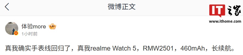 IT之家注意到,博主 @体验more 今日发文透露,真我手表线回归之作真我 realme Watch 5 型号为 RMW2501,内置 460mAh 电池,主打长续航体验。