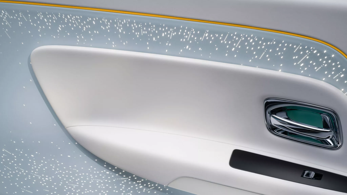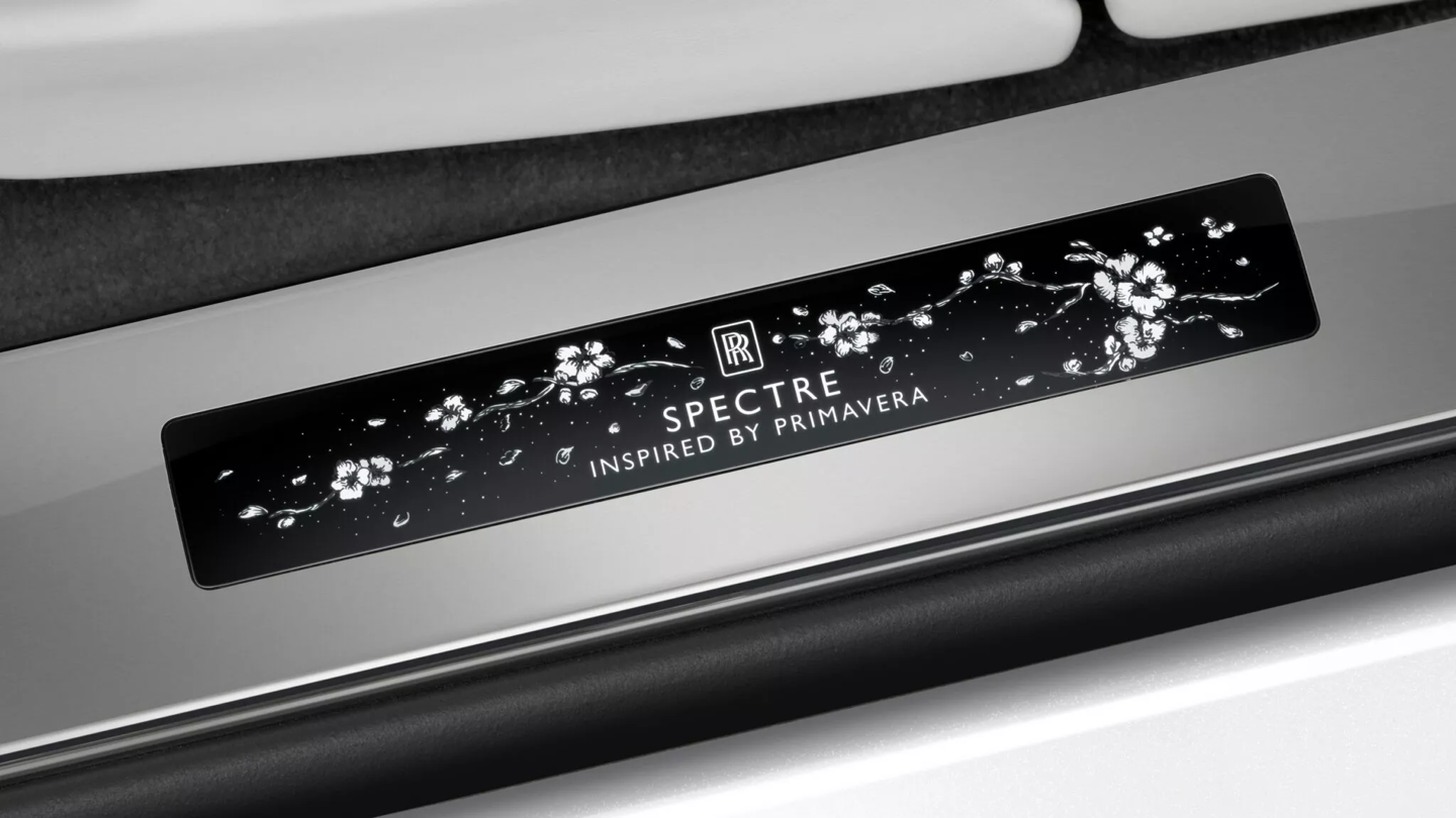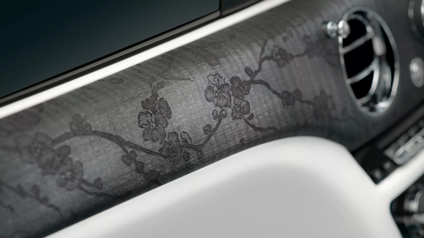 整车亮点是黑檀木饰板,饰板上雕刻樱花图案。劳斯莱斯表示,这种墙纸般的效果通过 37 种激光密度实验在抛光木材上创造平衡对比,并采用特殊打磨工艺,在保持细节的同时不影响表面光泽完成。