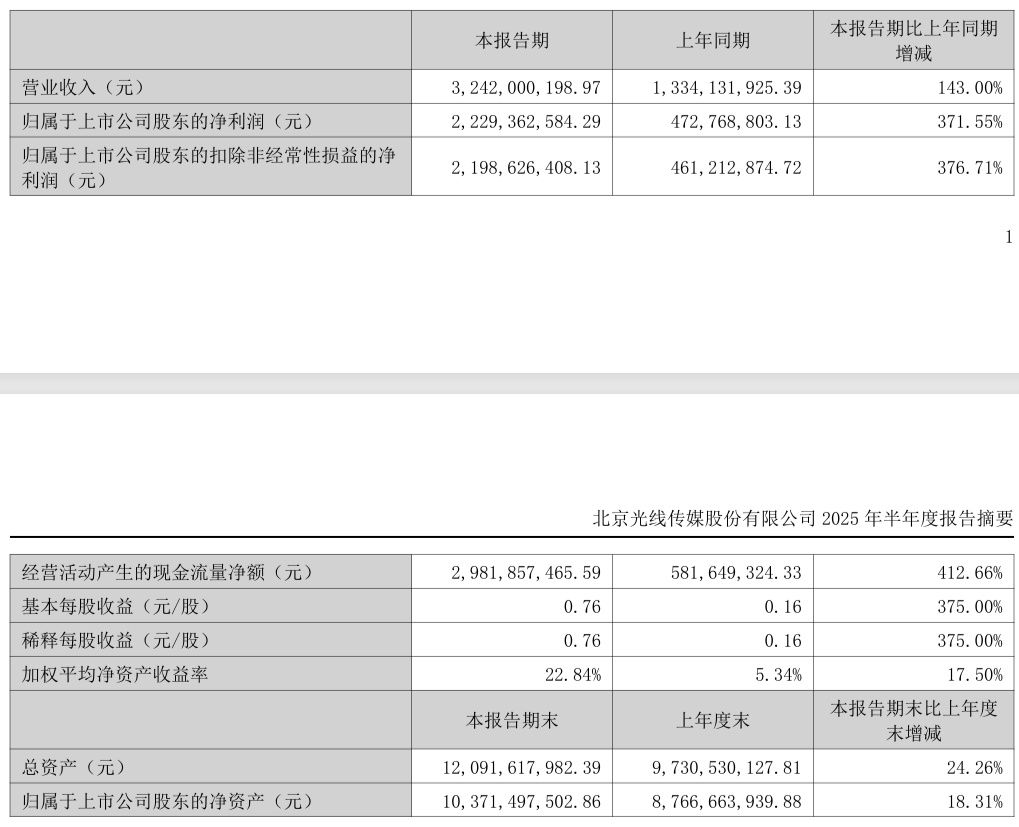 2025 上半年,光线传媒实现营业收入 32.42 亿元,同比增长 143%;