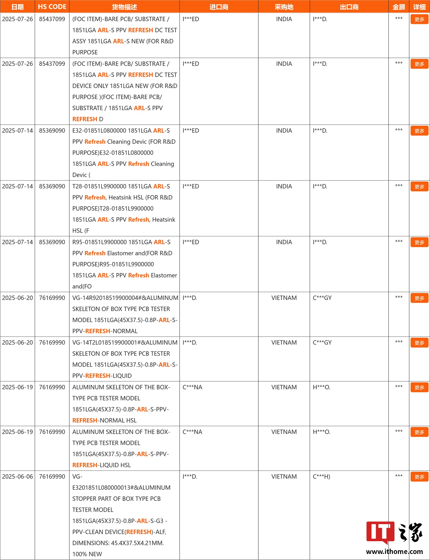 IT之家 8 月 27 日消息,参考 X 平台消息人士 @x86deadandback 的发现,第三方海关仓单信息平台 NBD 记录到了多条有关英特尔 "Arrow Lake-S Refresh" (ARL-S Refresh) 桌面处理器散热器、基板、测试设备的全球海关物流信息,这显示英特尔正积极展开 "Arrow Lake-S Refresh" 处理器的准备工作。