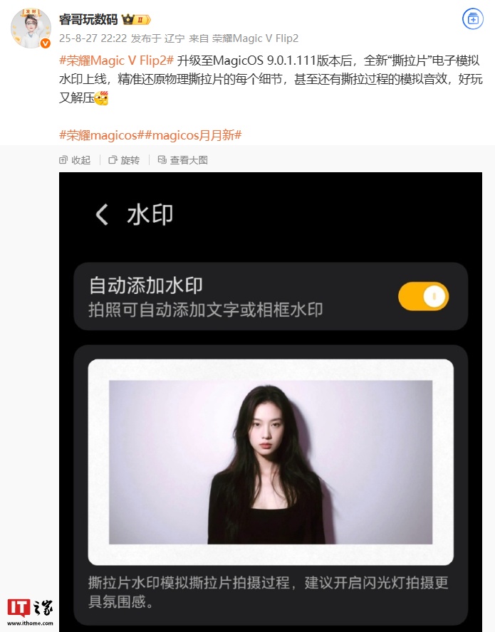 IT之家 8 月 27 日消息,据博主 @睿哥玩数码 今日分享,荣耀 Magic V Flip2 小折叠手机在升级至 MagicOS 9.0.1.111 版本后,新增“撕拉片”电子模拟水印。据称,该水印可还原物理撕拉片的细节,并拥有撕拉过程的模拟音效。