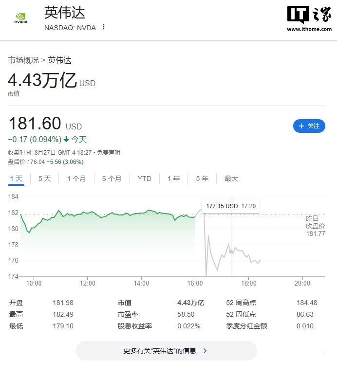 财报发布后,英伟达股价在盘后交易中一度下跌 4%,随后收窄至跌 1.83%,但到美东时间下午 4:36 跌幅扩大至 2.73%,4:47 跌至 3.5%。