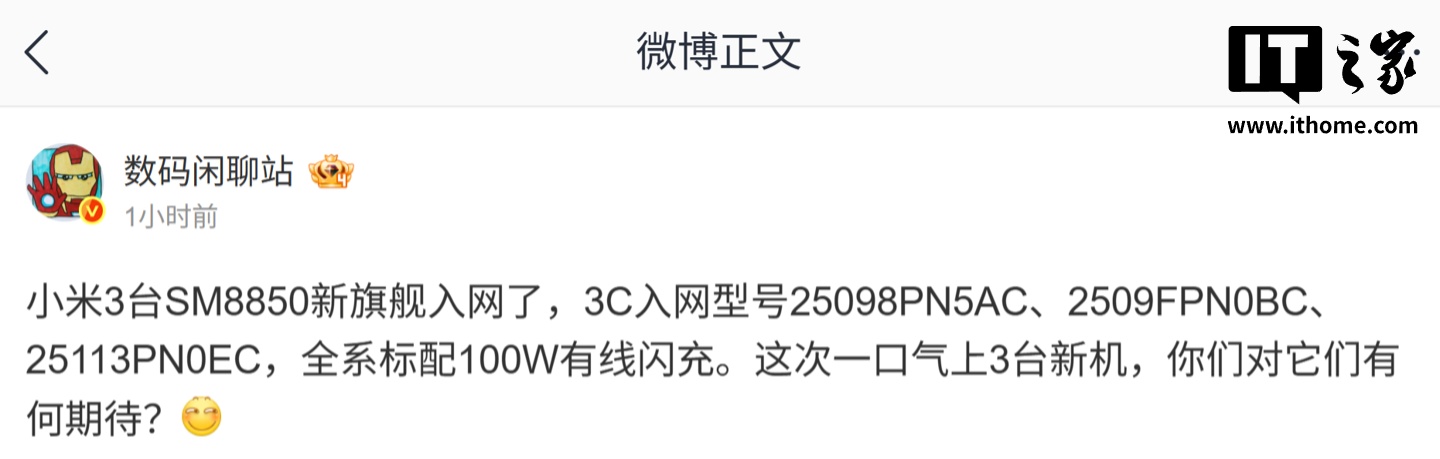 IT之家 8 月 28 日消息,博主 @数码闲聊站 今天在微博透露,三台小米 SM8850 芯片旗舰手机已入网,3C 型号分别为 25098PN5AC、2509FPN0BC、25113PN0EC,均支持 100W 有线快充。
