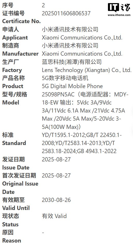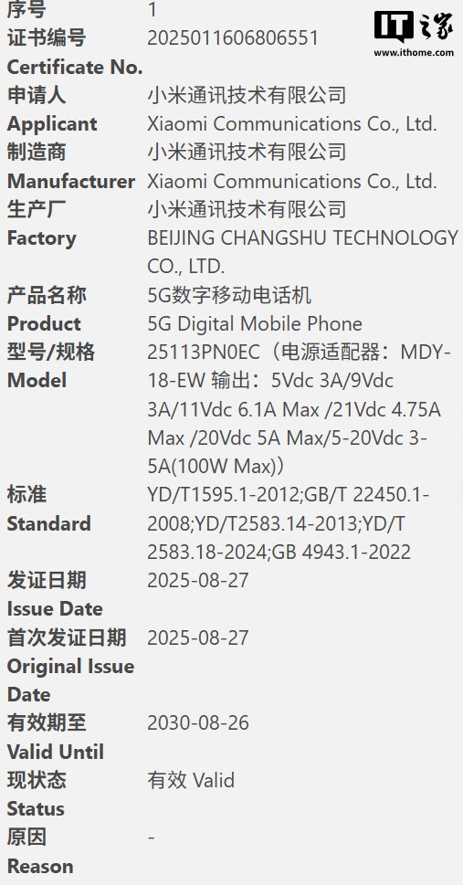 IT之家查询中国质量认证中心官网后发现,其中 25098PN5AC、25113PN0EC 已在网站公布,其中前者由蓝思科技 (湘潭) 有限公司生产,后者由小米通讯技术有限公司生产,两台手机均配备 MDY-18-EW 充电头,IT之家附上输出规格如下: