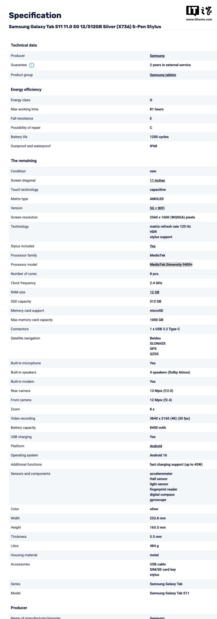 在续航方面,Tab S11 内置 8400mAh 电池,支持 45W 有线快充,平板具备 IP68 防尘防水等级,系统预装基于 Android 16 的 One UI 8。