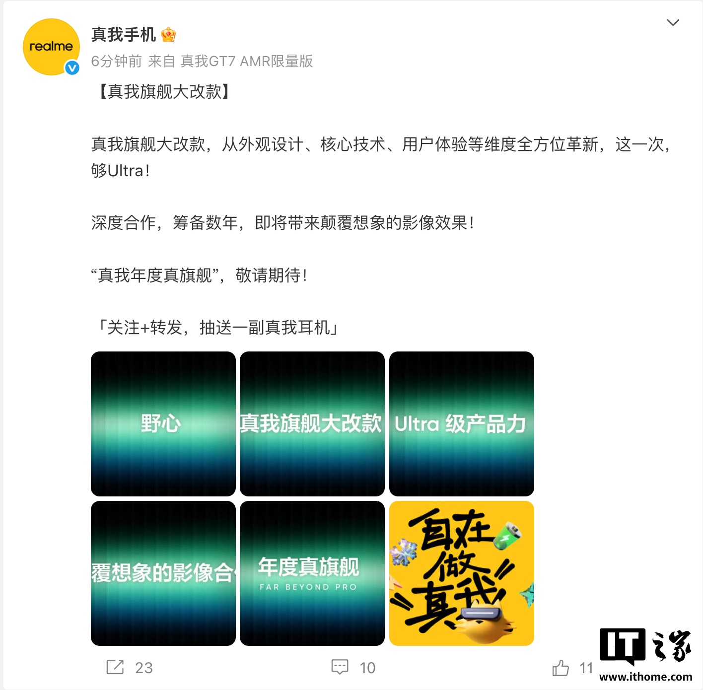 IT之家 8 月 28 日消息,realme 真我手机今天通过微博预热旗下新品“真我年度真旗舰”,其将实现真我旗舰“大改款”,从外观设计、核心技术、用户体验等维度全方位革新,官方更是喊出了“这一次,够 Ultra!”的口号。