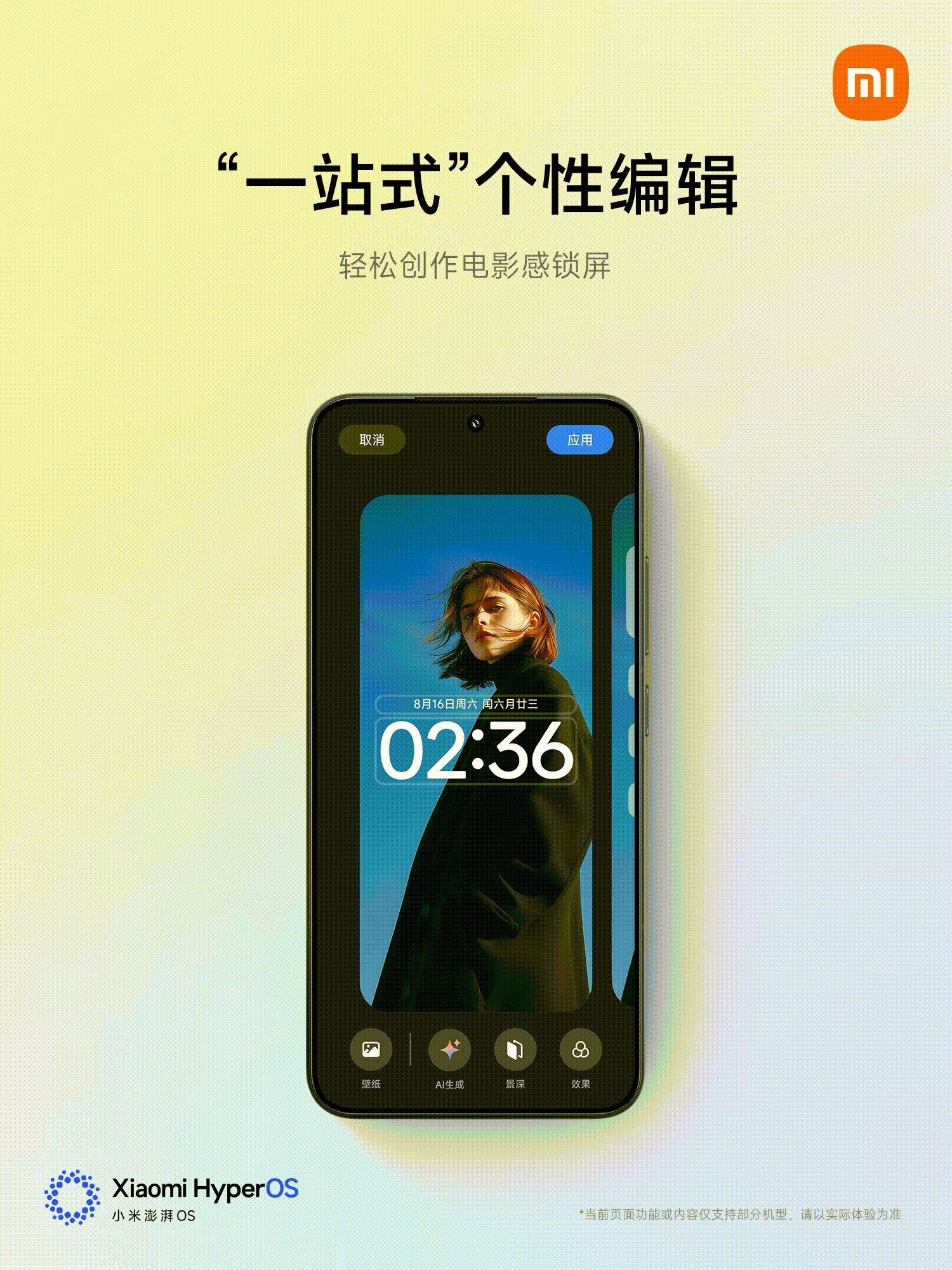 据介绍,小米澎湃 OS 3 支持 AI 动态化风格壁纸,配备全新居中大时钟锁屏,兼具艺术性与功能性,搭配出丰富的空间层次。此外,该系统还支持一站式编辑锁屏,轻松创作专属电影感锁屏。