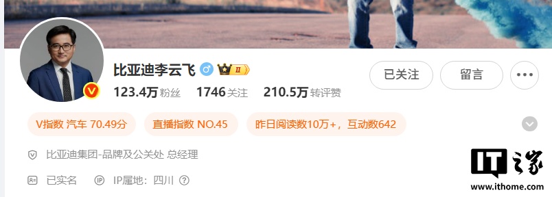 作为比亚迪的品牌官,首先得听劝。即日起,我的这个社交账号全部改名为“比亚迪李云飞”,让大家一搜就有,一看就懂。虽然名字变了,但人还是那个 —— 有激情、勤奋、认真、比较实诚,有点小愤的陕西武功人!