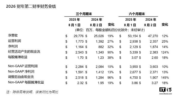 第二财季运营利润为 18 亿美元,同比增长 27%;非一般公认会计准则(以下简称“non-GAAP”)运营利润为 23 亿美元,增长 10%
