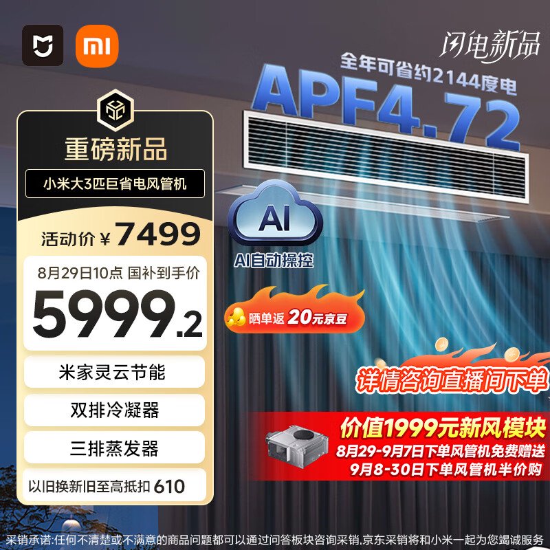 IT之家 8 月 29 日消息,小米智能生态官微今天上午宣布,米家中央空调巨省电风管机现已正式开售。其 APF 为 4.72,支持米家人感节能技术,提供大 3 匹、4 匹两种配置,到手价分别为 7499 元、8749 元(IT之家注:叠加国补后为 5999.2 元、6999.2 元起)。