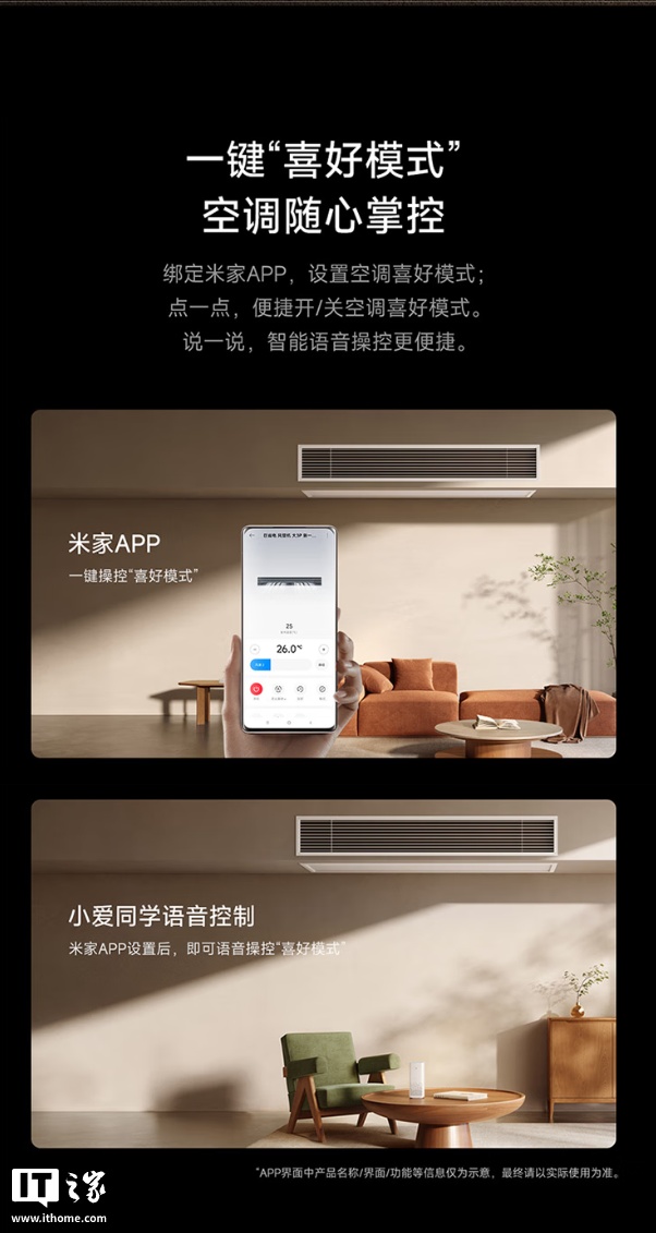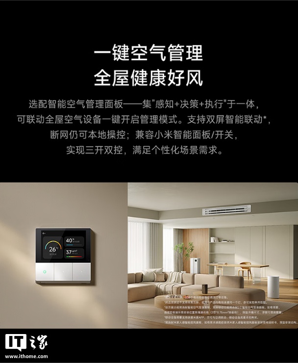 另外,这款空调标配线控器,可选配智能空气管理面板,这款面板自带彩屏,可联动全屋空气设备一键开启管理模式,支持断网操控,兼容小米智能面板 / 开关;空调支持小米澎湃智联,用户可在米家 App 内设置空调喜好模式。