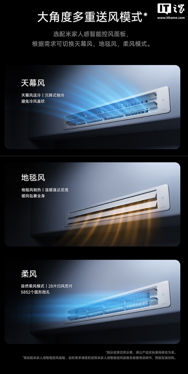 这款空调的出风口上还搭载有双毫米波雷达,可检测人的位置,实现 7m 内风吹人、风避人两种模式,并可智能识别无人状态,主动关机。同时空调支持多种送风模式,可根据需求切换各种风向。