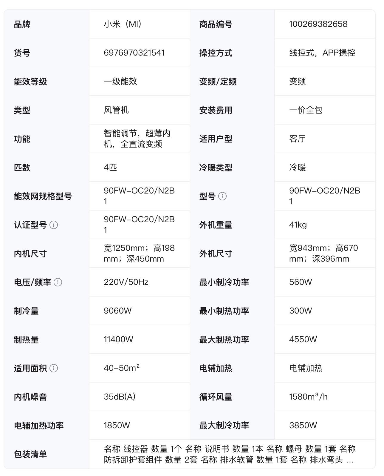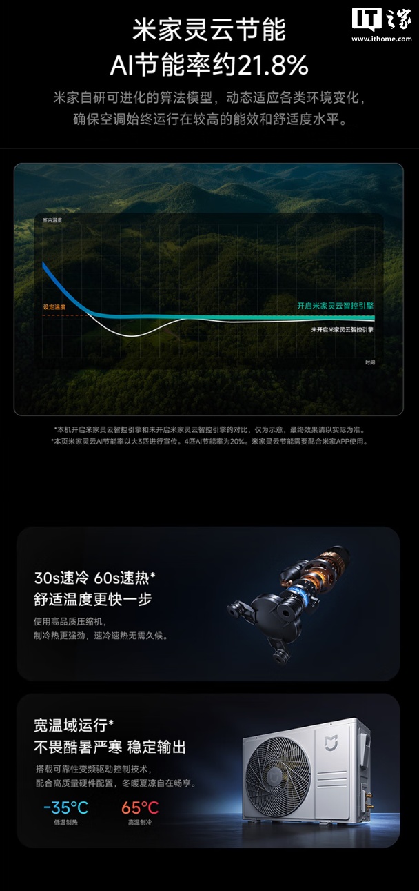 这款空调还配有米家自研算法,可动态适应各类环境变化,智能调节能耗、舒适度,内置高品质压缩机,号称“30 秒速冷、60 秒速热”,支持宽温域运行,可在-35°C 的环境下制热、65°C 的环境下制冷。
