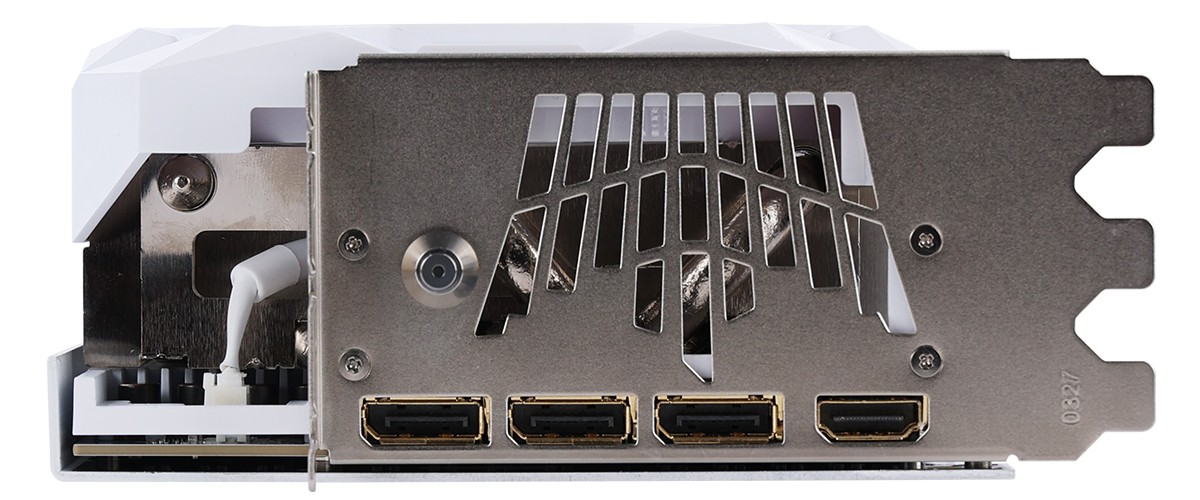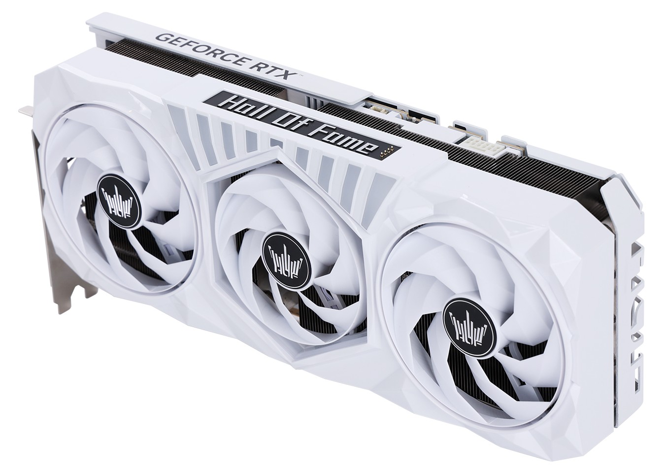 该显卡面盖外壳采用“圣白棱面切割”,搭载双 102mm 夹单 92mm 的三颗“霜环”风扇,中央风扇本体、上方齿状区域和可拆卸式皇冠灯件支持 ARGB 光效。