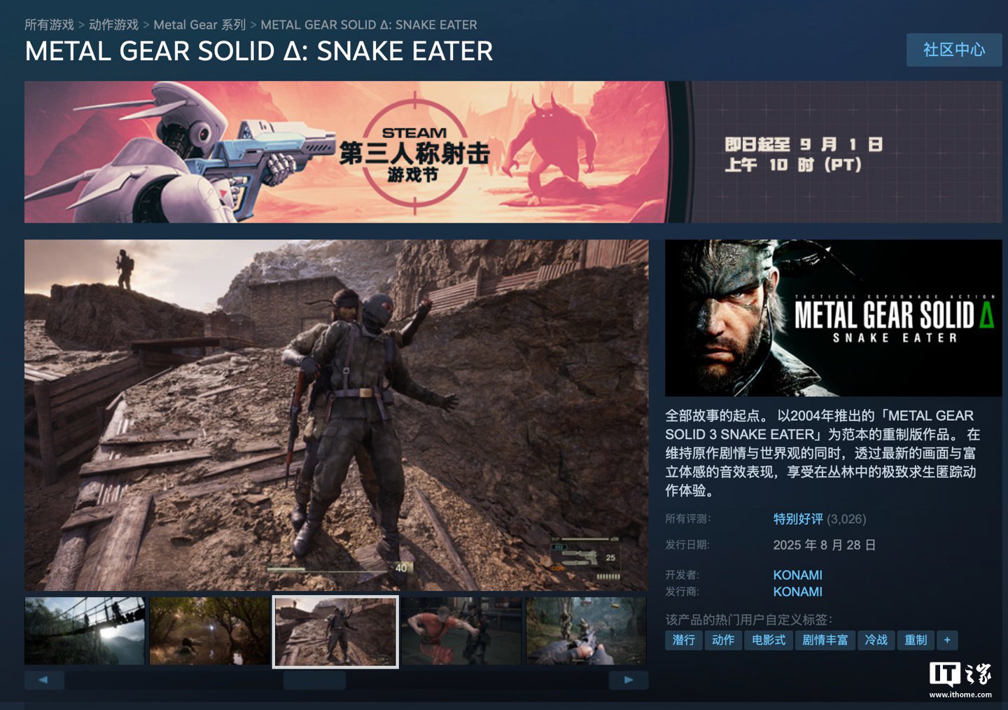 IT之家 8 月 29 日消息,基于 2004 年推出的《合金装备 3》为范本的完全重制版《合金装备 Δ:食蛇者(METAL GEAR SOLID Δ: SNAKE EATER)》现已正式发售,登陆 PlayStation 5、Xbox Series X|S 和 PC 平台,Steam 国区标准价 409 元,豪华版为 482 元,IT之家附商品页。
