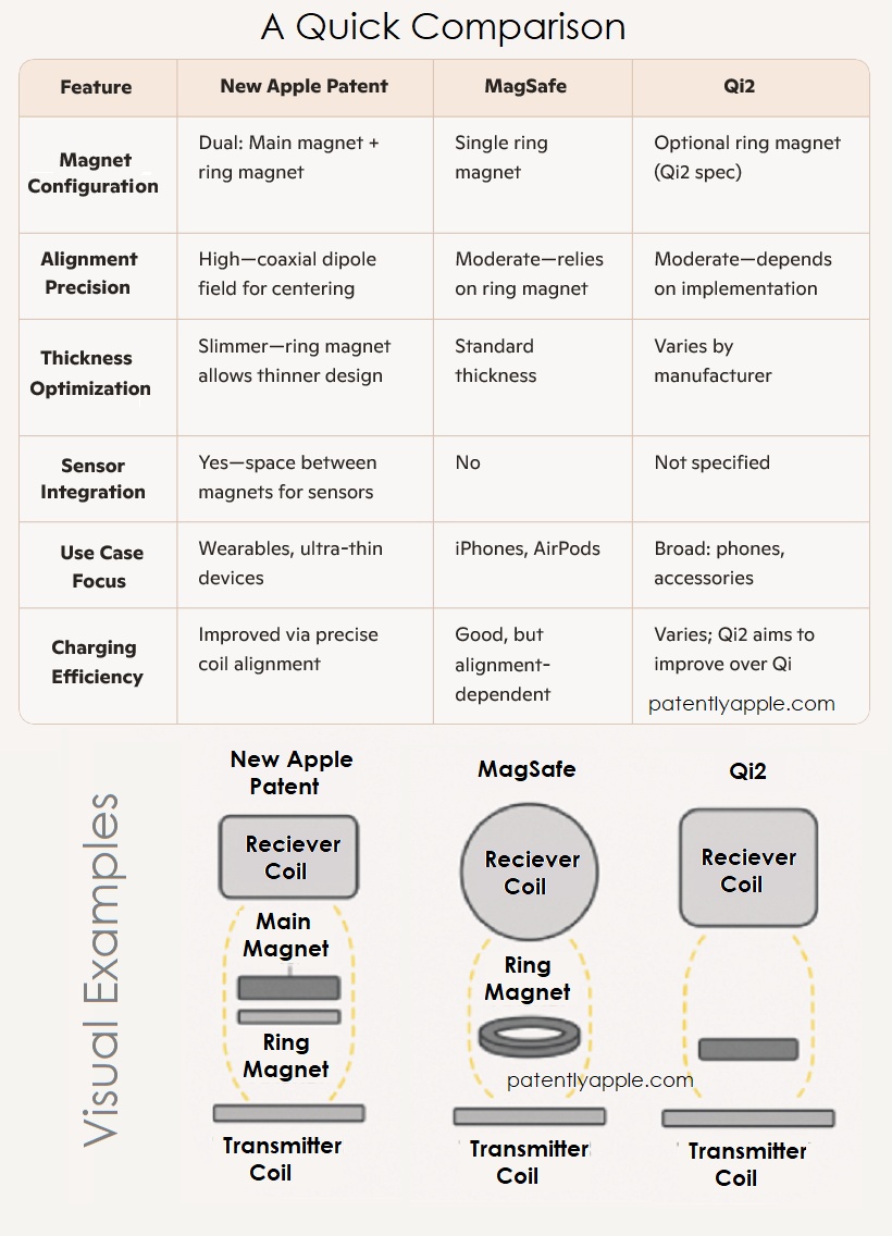 以上图源:patentlyapple专利还描述了磁性对准组件的具体结构:接收线圈环绕在主磁体周围,通过与充电端对应磁体的相互吸引,实现自动中心对位。整个系统的磁场设计模仿偶极模式,既确保精确定位,又减少用户手动调整的需求。