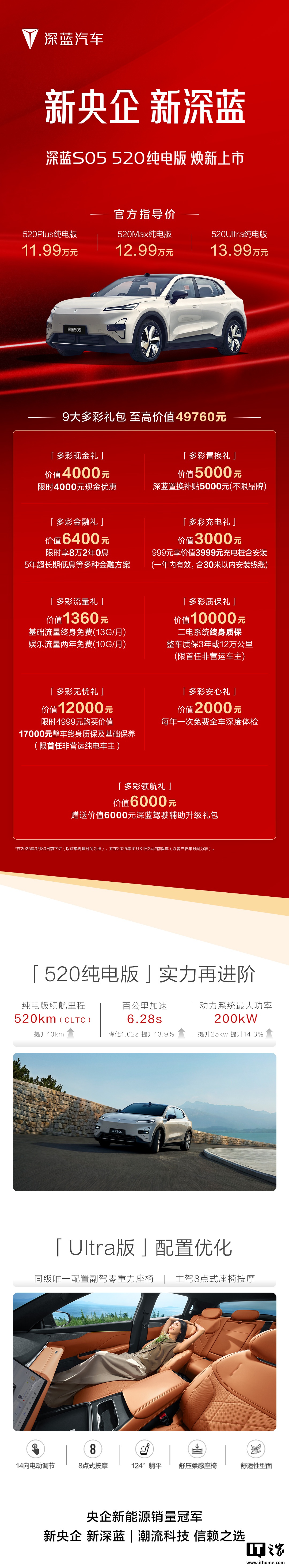 IT之家 8 月 29 日消息,2025 成都车展今日开幕,在本次车展上,新款深蓝 S05 520 公里纯电版车型正式上市,共推出 3 款车型,指导价格区间为 11.99 万至 13.99 万元。作为新增车型,该车型在外观及内饰造型方面基本保持了现款车型的设计风格。