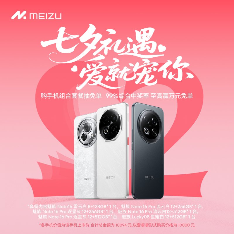 IT之家 8 月 29 日消息,魅族今天在天猫平台上线了一款“七夕相遇”手机套装,内含 1 台魅族 Note 16、4 台 Note 16 Pro 及 1 台 Lucky 08,总计有 6 台手机,售价 10000 元。
