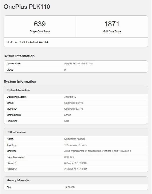 IT之家 8 月 30 日消息,科技媒体 GSMarena 昨日(8 月 29 日)发布博文,报道称型号为“PLK110”的一加手机现身 GeekBench 跑分库,由于搭载了高通第二代骁龙 8 至尊版芯片。