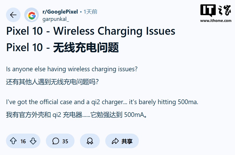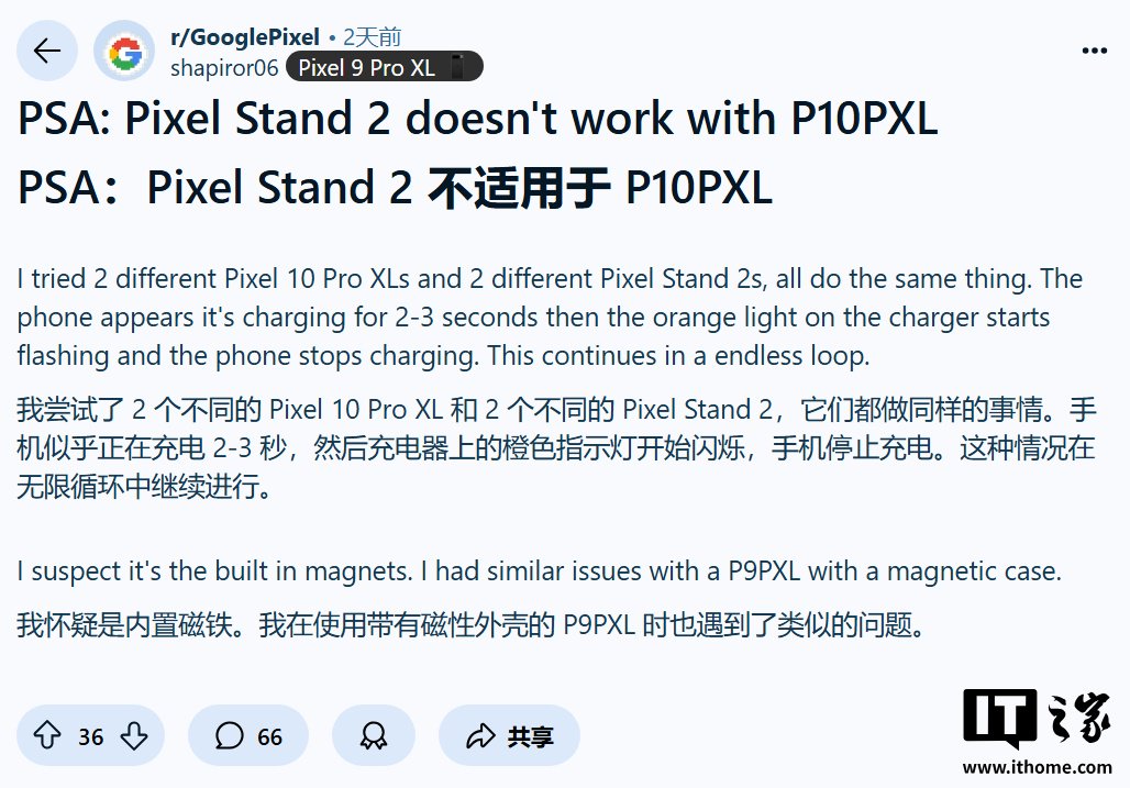 有用户称,Pixel 10 系列在搭配使用现有无线充电器后,连接几秒或几分钟后就会停止充电。一些人还遇到充电速度大幅下降的情况,在旧款 Qi 无线充电器(包括 Pixel Stand 二代)上功率只有约 5W。IT之家附上相关用户反馈如下: