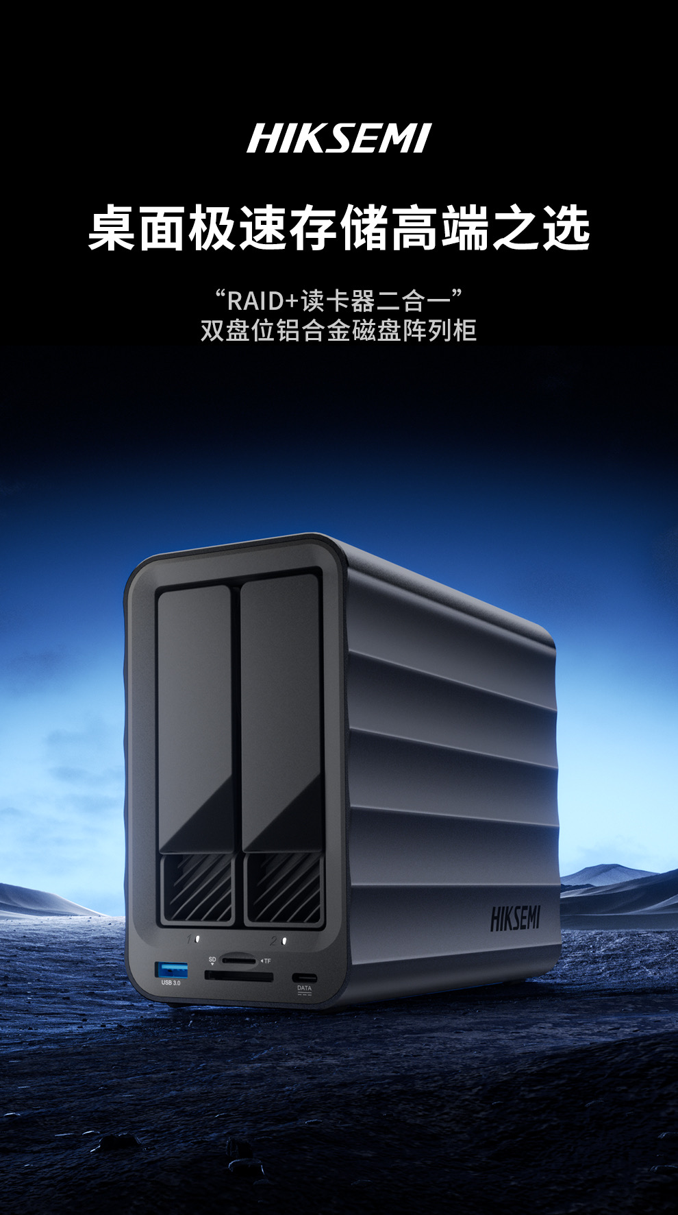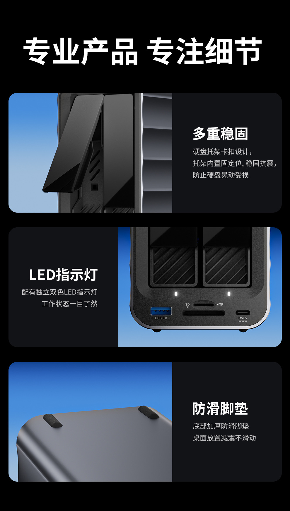 该产品单盘支持 24TB 容量硬盘读取,双盘合并存储容量可达 48TB。同时,其具备三重散热结构,铝合金机身内置强散热风扇、大面积格栅背板,可高效导出内部热量。