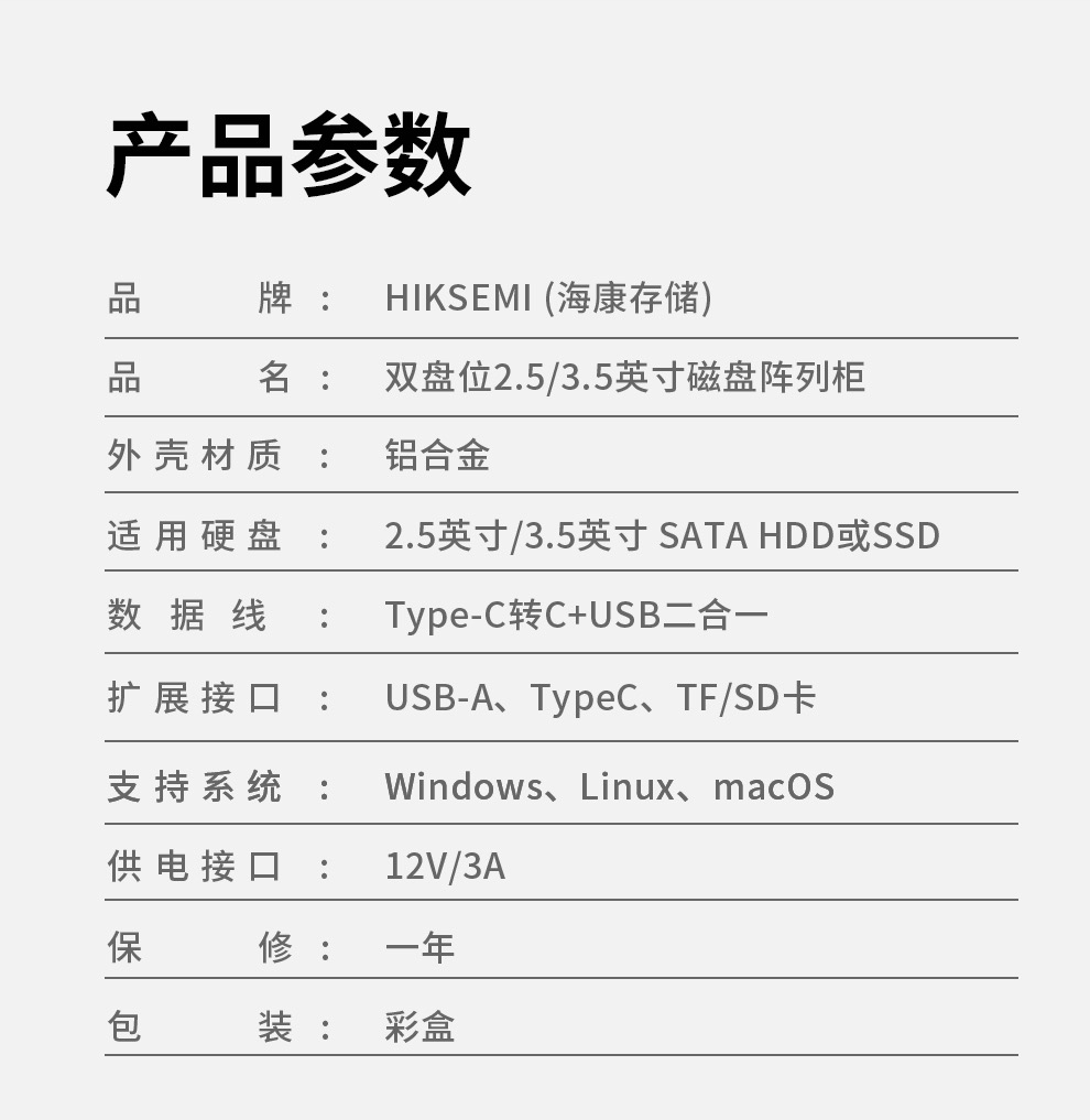 兼容性方面,其支持 2.5/3.5 英寸 SATA 硬盘、U 盘、SD / TF 卡,兼容 Windows / macOS / Linux 系统,无需安装驱动即插即用。
