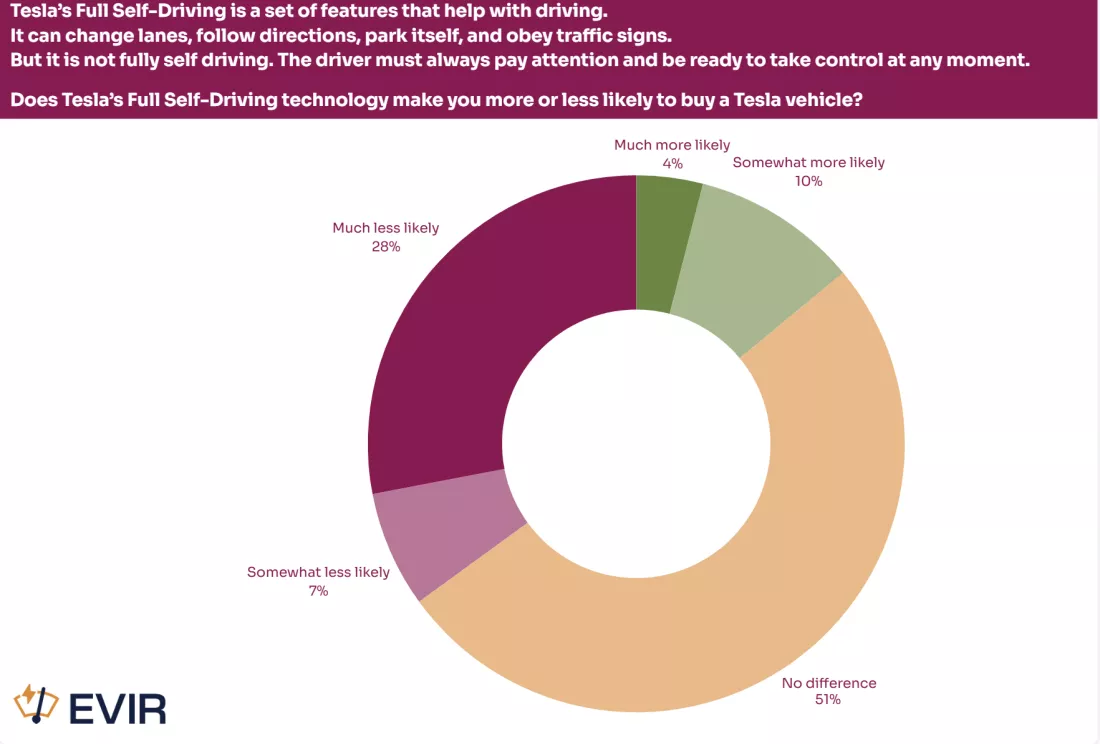 IT之家援引博文介绍,Slingshot Strategies 公布了最新美国《电动车情报报告》,邀请超过 8000 美国车主参与调查,仅 14% 的受访者表示看好 FSD,是让其更倾向购买特斯拉的选购因素之一,35% 表示因此更不想购买,51% 称没有影响。