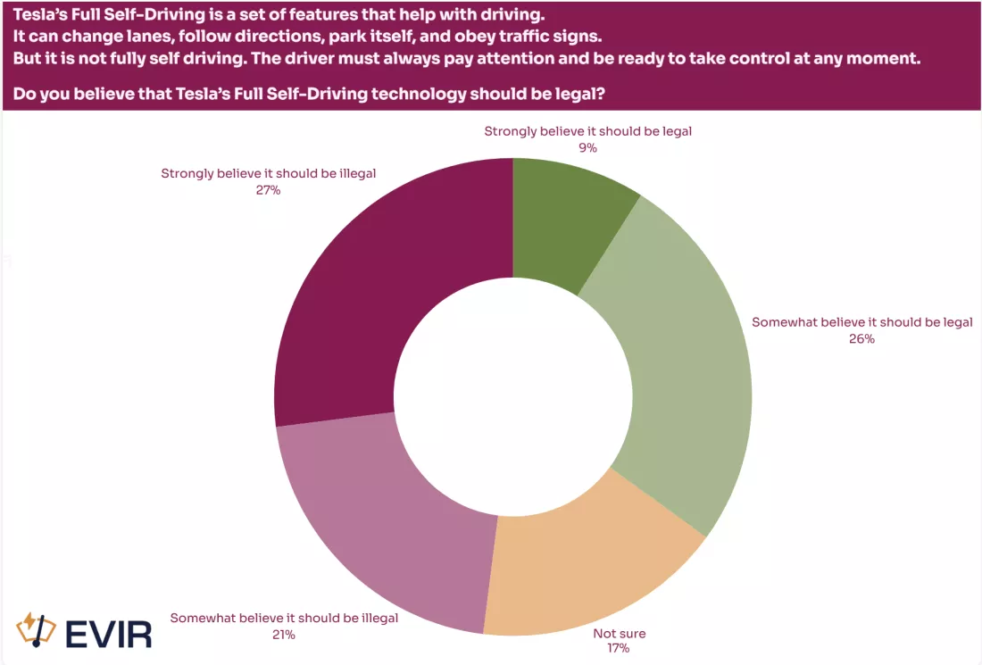 IT之家 8 月 30 日消息,科技媒体 TechSpot 昨日(8 月 29 日)发布博文,报道称一项覆盖 8000 多名美国消费者的新调查显示,特斯拉的 FSD 智能辅助驾驶功能不仅未能吸引买家,反而让 35% 的人更不愿购买,此外近半数受访者认为该技术应属非法。