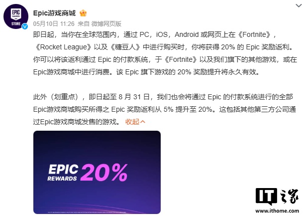 IT之家从此前官方公告获悉,5 月 10 日起,当玩家在全球范围内,通过 PC、iOS、Android 或网页上在《Fortnite》《Rocket League》以及《糖豆人》中进行购买时,你将获得 20% 的 Epic 奖励返利。你可以将该返利通过 Epic 的付款系统,于《Fortnite》以及我们旗下的其他游戏,或在 Epic 游戏商城中进行消费。该 Epic 旗下游戏的 20% 奖励提升将永久有效。